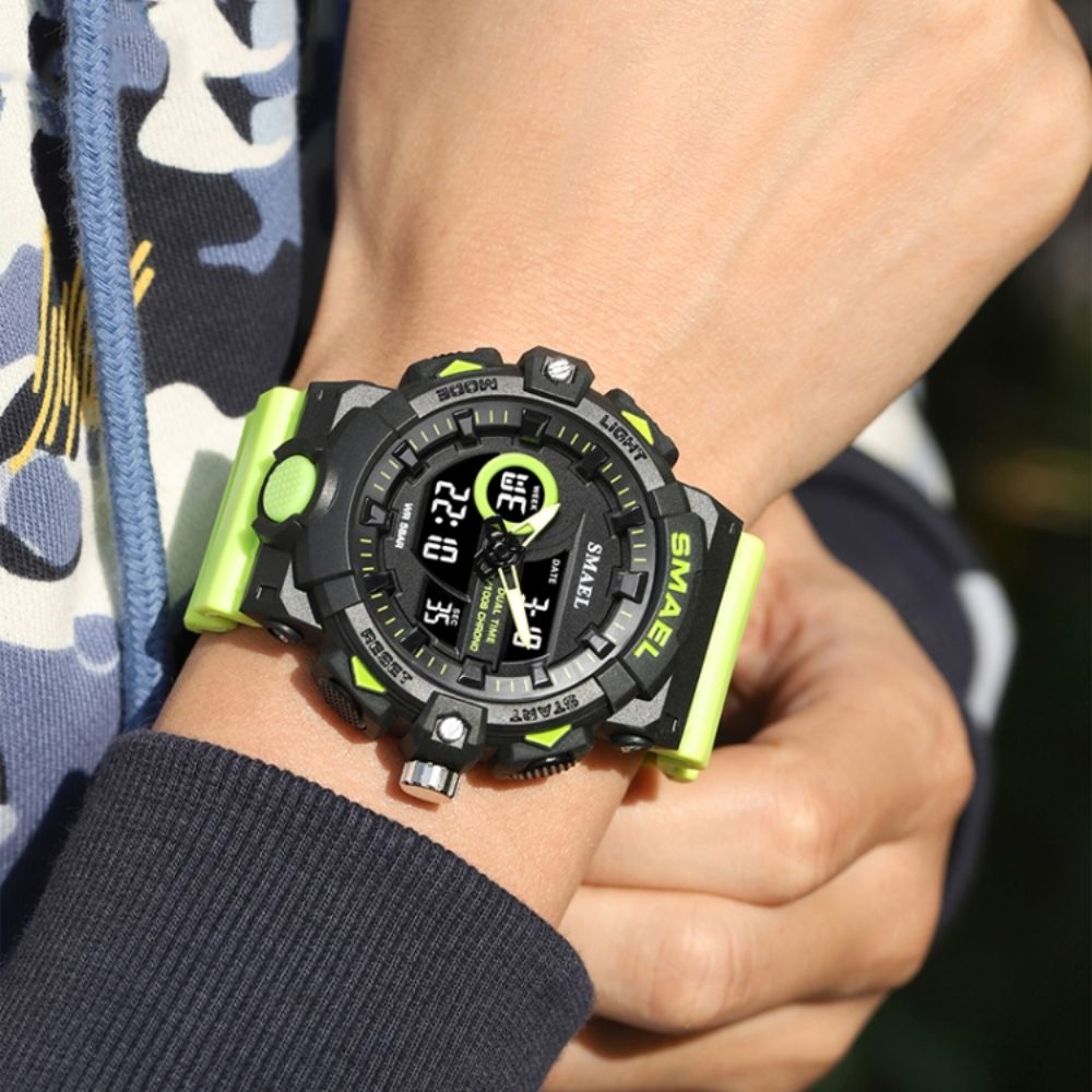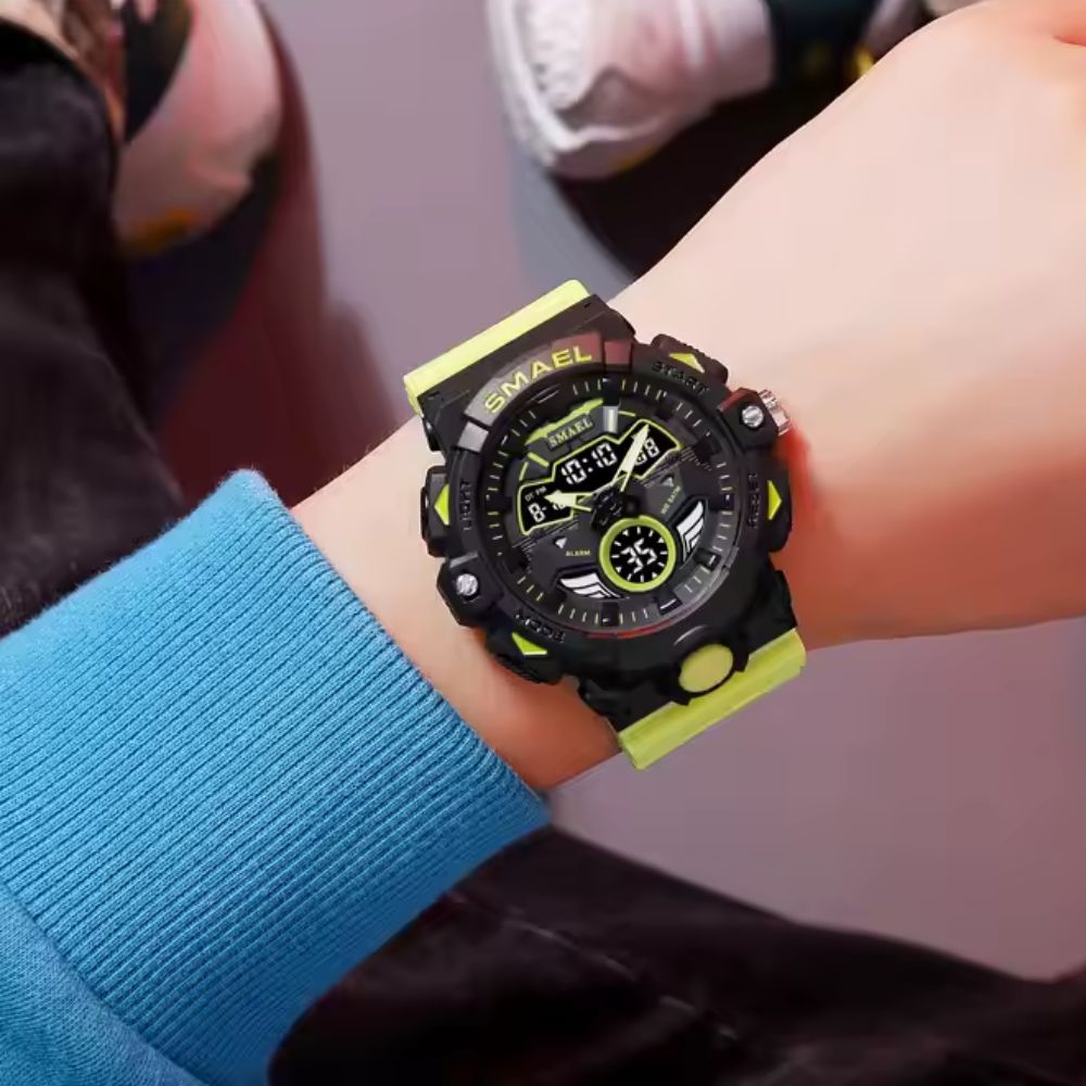 O Smael combina design moderno com resistência extrema, criando o relógio perfeito para quem busca mais do que um simples acessório. Feito para suportar os desafios do dia a dia e aventuras ao ar livre, ele vai te acompanhar em qualquer situação. Com resistência à água e impactos, ele nunca vai te deixar na mão.