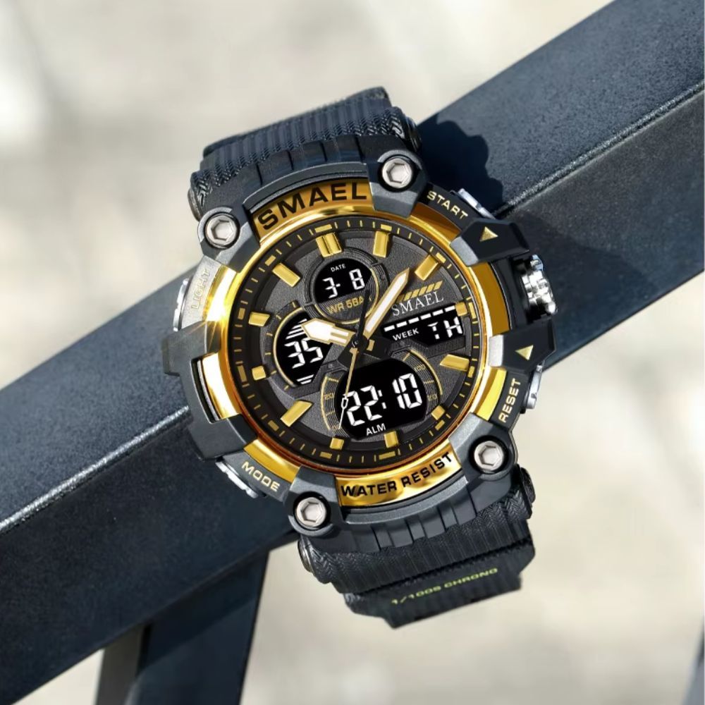O Smael é o relógio ideal para quem não tem medo de arriscar e viver intensamente. Resistente a impactos e água, ele é feito para encarar os desafios mais extremos com elegância e confiança. Seu design imponente e robusto destaca sua personalidade, fazendo com que você se sinta seguro e preparado para qualquer situação.